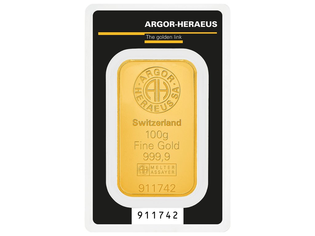 Investiční zlatý slitek 100g Argor Heraeus SA nabízí bezpečný způsob uchování hodnoty s vysokou likviditou. Prémiová kvalita švýcarské rafinérie Argor Heraeus, certifikace a ryzost 999,9/1000 z něj činí ideální volbu pro dlouhodobou investici.