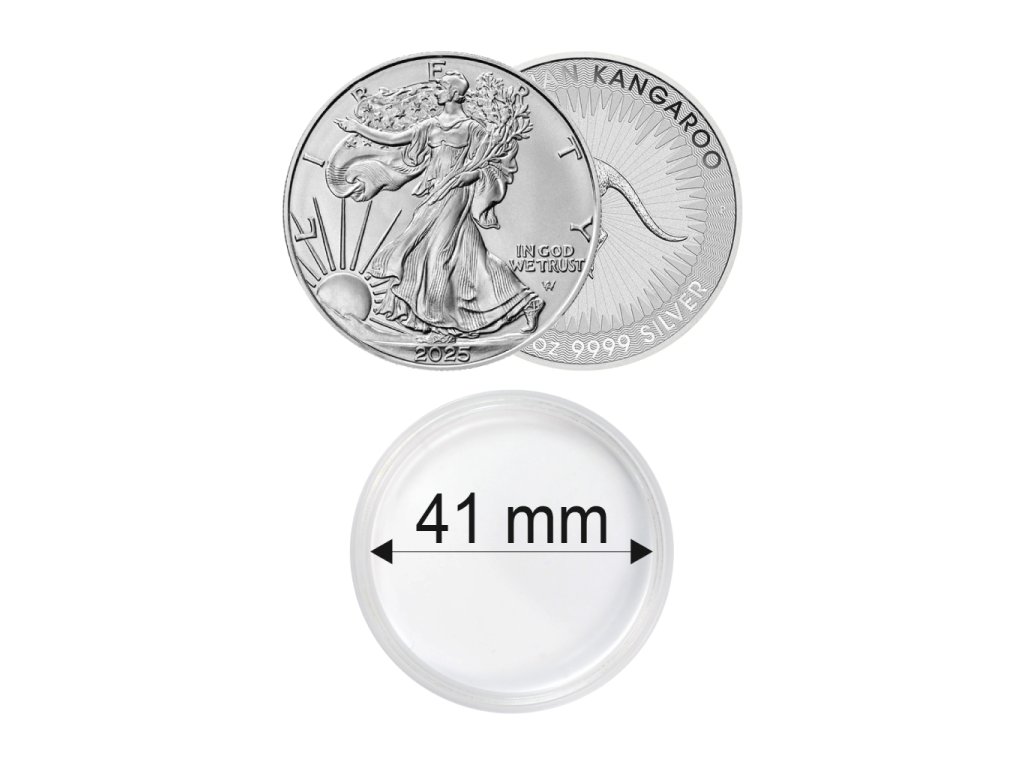 Kvalitní plastové kapsle ideální pro bezpečné a elegantní uložení mincí American Eagle, Kangaroo o průměru 41 mm. Balení obsahuje 10 ks kapslí.
