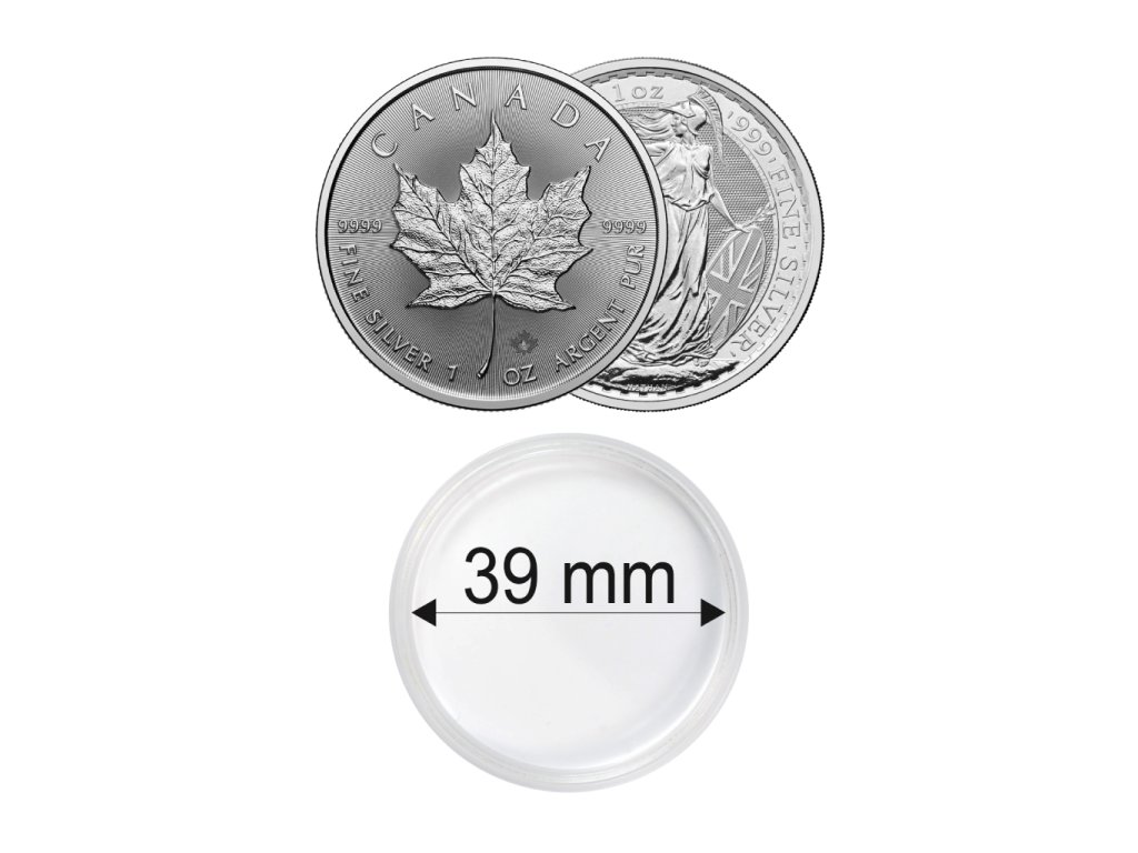 Kvalitní plastové kapsle ideální pro bezpečné a elegantní uložení mincí Maple Leaf, Britannia o průměru 39 mm. Balení obsahuje 10 ks kapslí.
