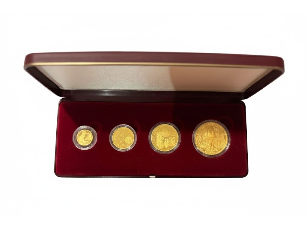 Kompletní sada zlatých mincí Karel IV. 1999 proof představuje mimořádně vzácný sběratelský celek, který se na trhu objevuje jen výjimečně. Mince jsou raženy z ryzího zlata 999,9/1000 v nejvyšší kvalitě proof a nesou nominální hodnotu 10 000 Kč, 5 000 Kč, 2 500 Kč a 1000 Kč garantovanou Českou republikou. Celkový obsah zlata v sadě činí 1,85 trojské unce (oz), tedy přibližně 57,54 g ryzího zlata.