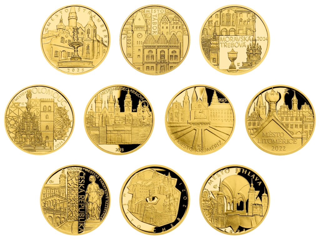 Kompletní sada zlatých mincí Městské památkové rezervace 2021–2025 – deset mincí o hmotnosti 1/2 oz (celkem 155,5 g zlata), ryzost zlata 999,9/1000, provedení proof, vydáno Českou národní bankou v limitované edici. Ucelená série s vysokým sběratelským významem.