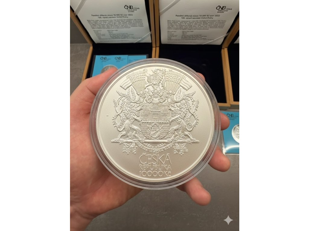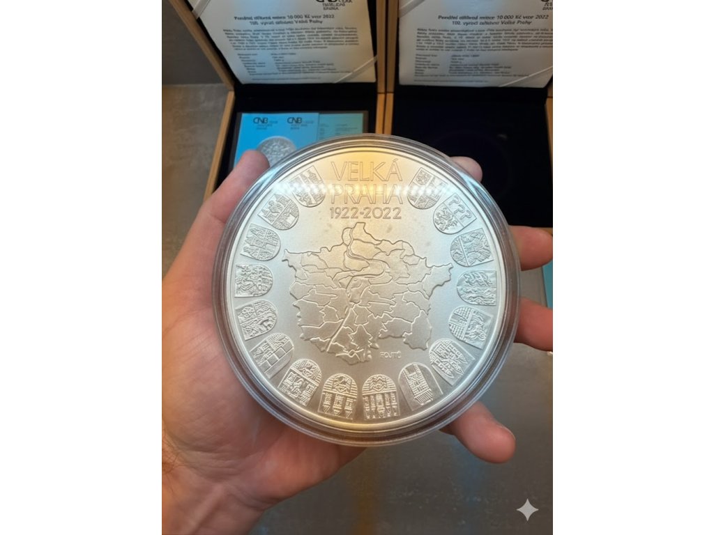 Kilogramová stříbrná mince od České národní banky s nominální hodnotou 10 000 Kč v standardním provedení je vydána k 100. výročí založení Velké Prahy, které oslavíme v roce 2022.