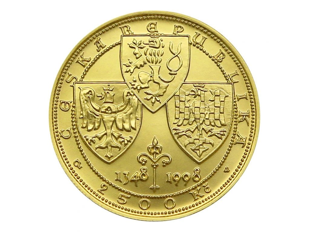 2.500 Kč (1/4 oz) je věnována právním dokumentům Karla IV. Ústředním motivem lícní strany jsou zemské znaky v gotických štítech, český lev uprostřed, po pravé straně moravská orlice, po levé straně slezská orlice, pod štíty v řádce jsou letopočty "1348 - 1998". Název státu "ČESKÁ REPUBLIKA" je v neuzavřeném opisu v horní polovině mince, při dolním okraji mince je v neuzavřeném opisu uvedena hodnota "2.500 Kč". Opisy jsou od hrany i obrazu mince odděleny perlovci. Rubovou stranu vyplňuje rekognizační znamení (monogram) Karla IV., používané na právních dokumentech místo osobního podpisu panovníka, doplněné po pravé straně jeho pečetí českého krále. Po stranách znamení je uvedeno jméno "KAREL IV.", označení hmotnosti "1/4 oz" a ryzosti kovu "Au 999,9". Autorkou mince je akademická sochařka Jarmila Truhlíková-Spěváková.