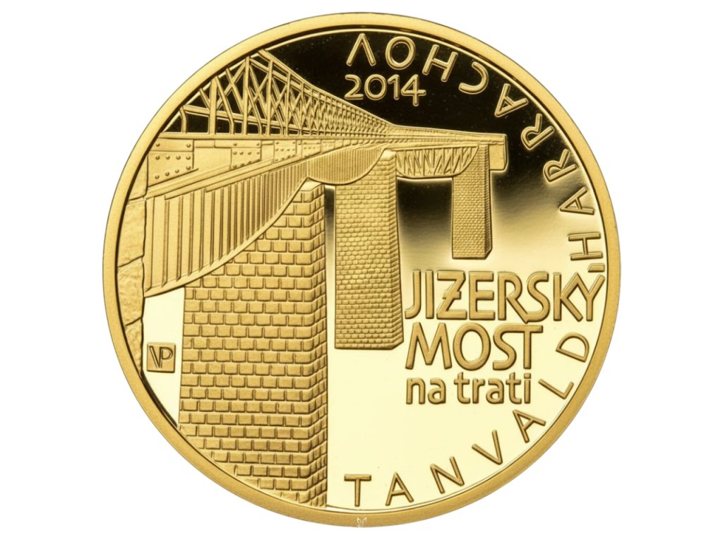 Jizerský most na trati Tanvald-Harrachov proof 2014 – zlatá mince, 15,55 g, ryzost zlata 999,9/1000, provedení proof, limitovaná edice, cyklus ČNB Mosty, investiční a sběratelská mince, mince spojující stabilní hodnotu zlata s rostoucím sběratelským zájmem.