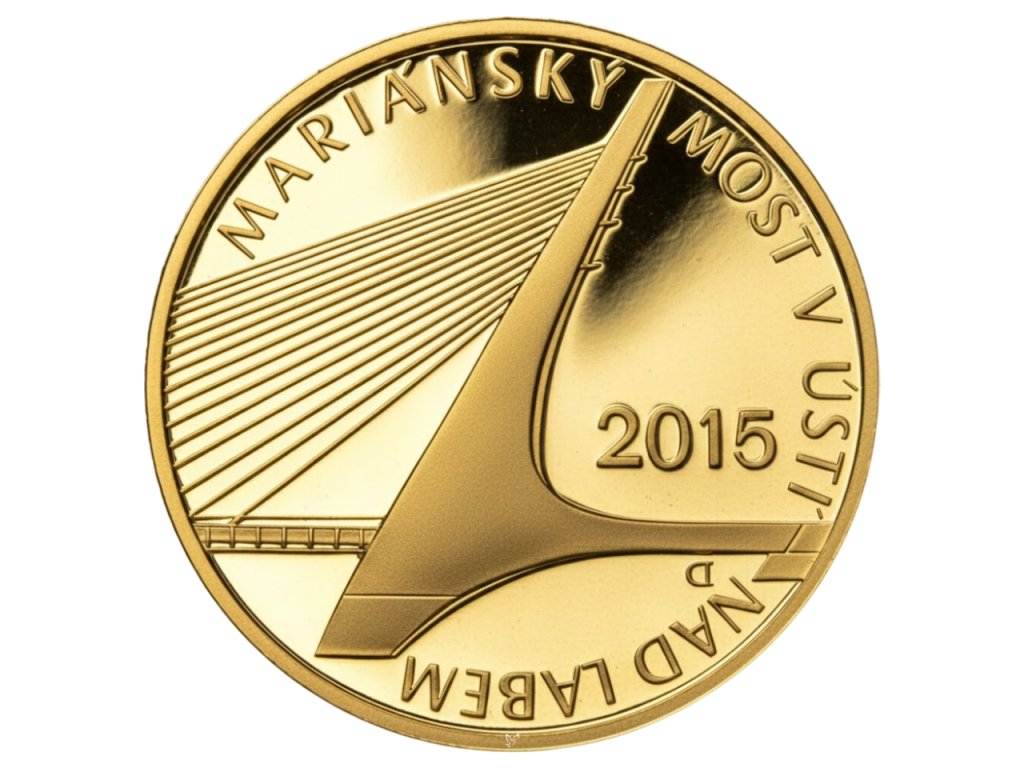 Mariánský most v Ústí nad Labem proof 2015 – zlatá mince, 15,55 g, ryzost zlata 999,9/1000, provedení proof, limitovaná edice, cyklus ČNB Mosty, investiční a sběratelská mince, mince spojující stabilní hodnotu zlata s rostoucím sběratelským zájmem.