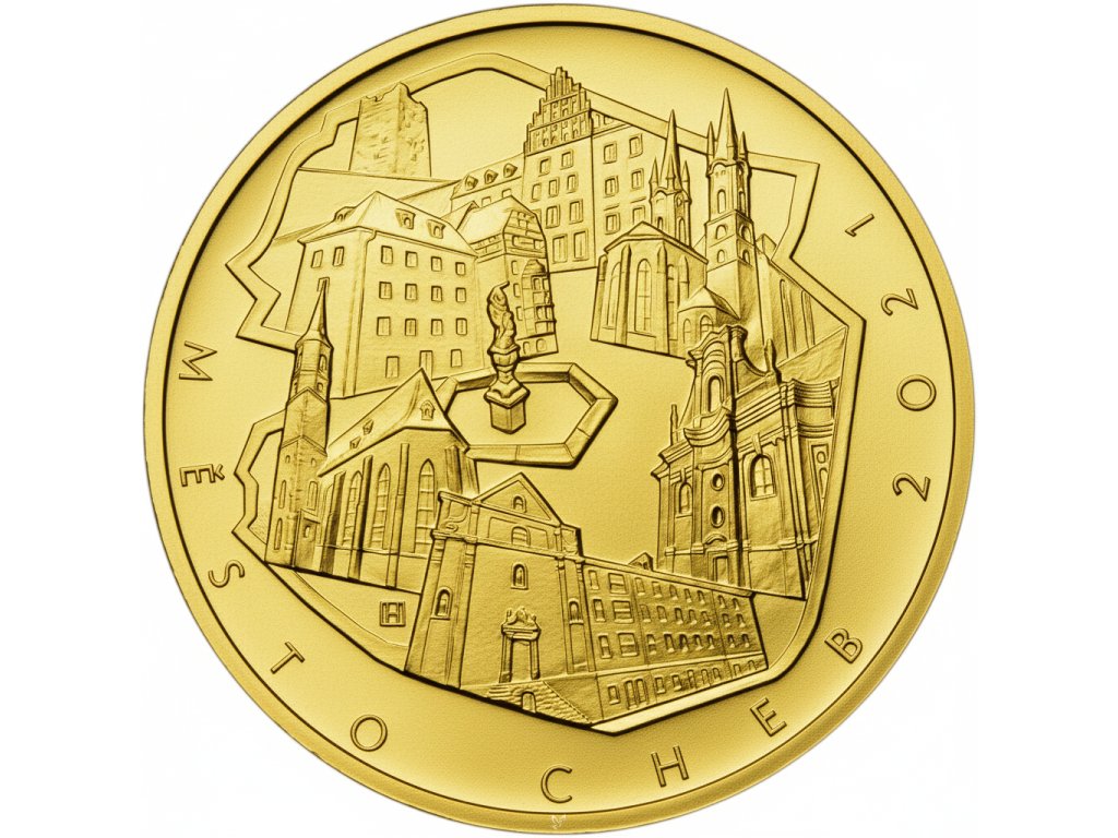 Cheb standard 2021 – zlatá mince, 15,55 g, ryzost zlata 999,9/1000, provedení standard (B.K.), limitovaná edice, cyklus ČNB Městské památkové rezervace, investiční a sběratelská mince, mince spojující stabilní hodnotu zlata s rostoucím sběratelským zájmem.